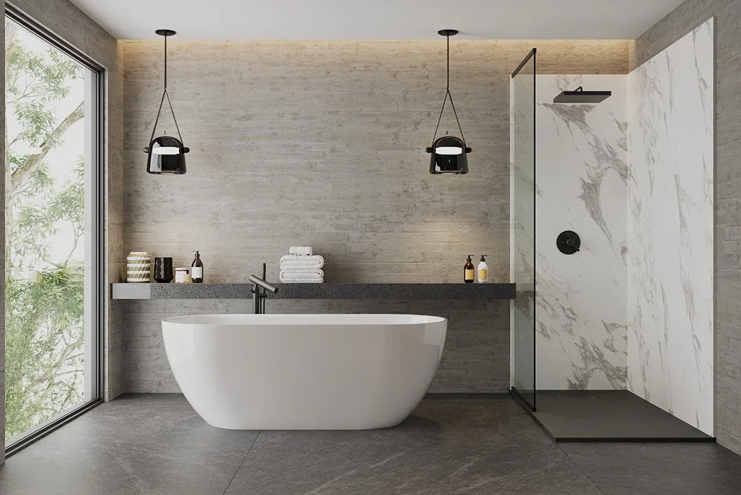 High gloss Acrylic paneling not only save on cost but reduce maintainance over traditional tile wall finishes.